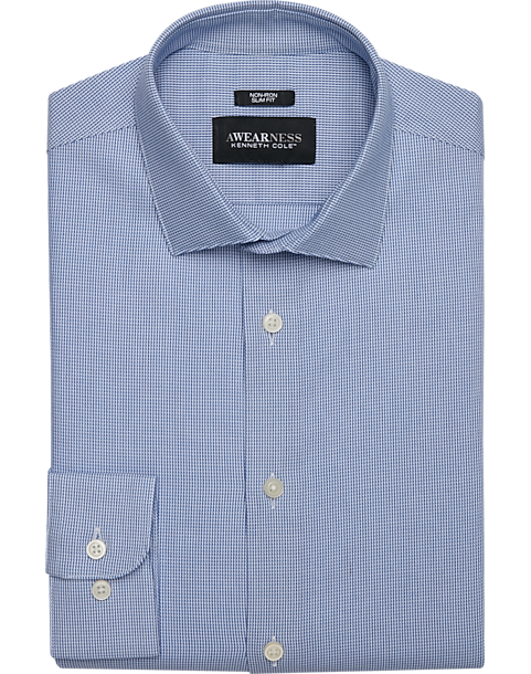 Look your very best with this stylish dress shirt by Awearness Kenneth Cole. This shirt keeps you comfortable in fine cotton blend fabric with a touch of stretch. Comfortable and in an slim fit, this dress shirt has a spread collar and smooth, no pocket front. The blue check pattern pairs well with your choice of ties, sweaters, vests, jackets. Slim Fit is slim and tapered across the chest, shoulders, armholes, waist and sleeves without compromising on comfort. Recommended for more triangle body types (broad shoulder and chest, narrow waist and hips).