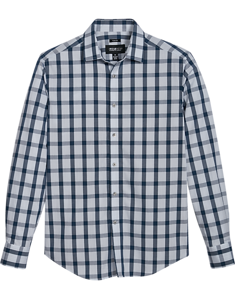 In a striking bold grid pattern, this sport shirt is cut slim, giving it a well-tailored look. The cotton-blend fabric is ideal for year-round wear.