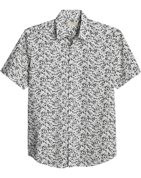 Enjoy the warmer days in this woven cotton camp shirt by Jaymes. The shirt, which features a clover pattern in black, is cut roomy and boxy to help you stay cool and comfortable.