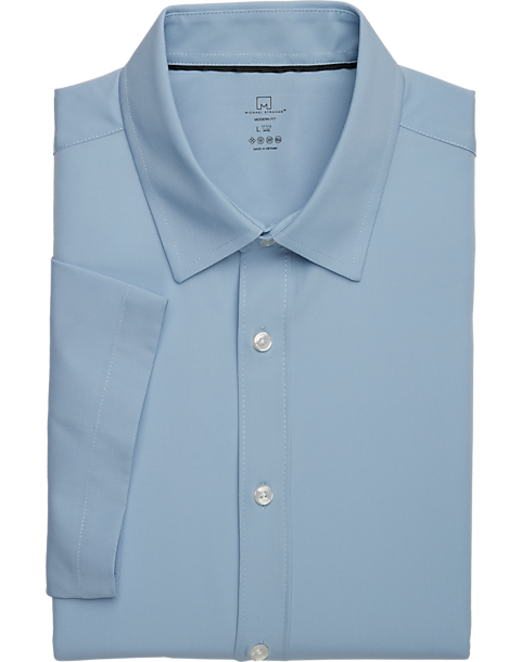 Dress to impress while keeping cool on sunny days with this short-sleeve dress shirt from Michael Strahan. Fashioned with a crisp, spread collar and a trim, Modern Fit, it pairs well with dress slacks, khakis, or jeans. Modern Fit is close-fitting without being constricting through the chest, body, and sleeve. Recommended for more rectangular body types (shoulders aligned with hips, with the waist slightly smaller).
