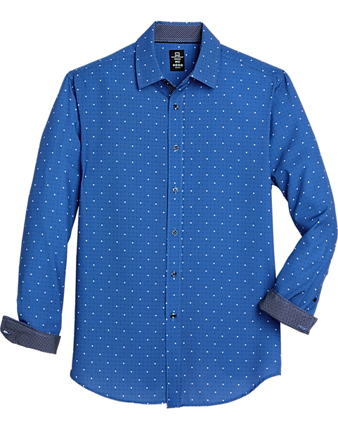 Bold and sporty in a navy swirl dot pattern, this standout sport shirt from Collection by Michael Strahan features a trim, Slim Fit, contrast lining in the cuffs, and a comfortable performance fabric with 4-way stretch.