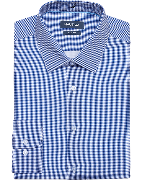 With a flattering fit, this comfortable dress shirt from Nautica is crafted from four-way stretch fabric that retains its shape. A Slim Fit trims and tones the silhouette for a modern edge. Slim Fit is slim and tapered across the chest, shoulders, armholes, waist and sleeves without compromising on comfort. Recommended for more triangle body types (broad shoulder and chest, narrow waist and hips).