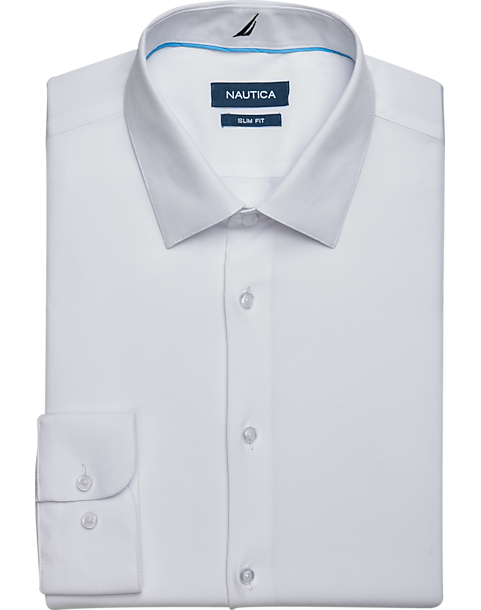Designed to flex with your every move, this dress shirt from Nautica is made from a comfortable fabric blend with four-way stretch. A Slim Fit gives it a modern silhouette that trims and tones. Slim Fit is slim and tapered across the chest, shoulders, armholes, waist and sleeves without compromising on comfort. Recommended for more triangle body types (broad shoulder and chest, narrow waist and hips).