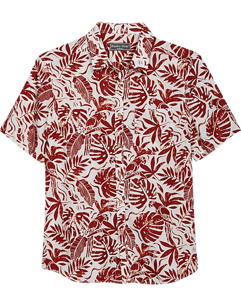 Get that vacation vibe when you wear this stylish, retro-inspired sport shirt by Paisley & Gray. This comfortable, short sleeve shirt features a tropical parrot and leaf pattern in a trim, Slim Fit.