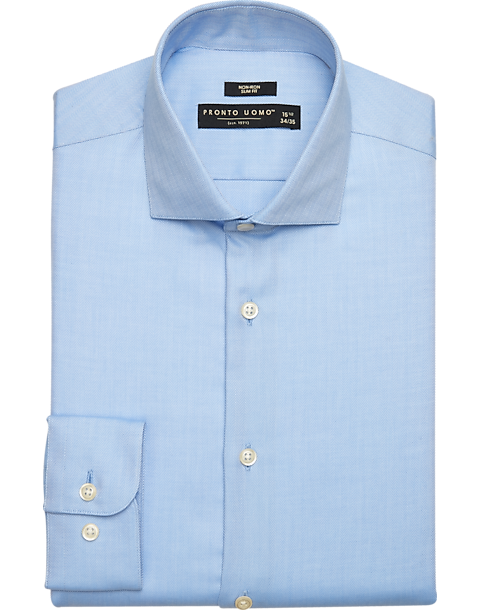 With a Slim Fit for a trim look that leans more modern, this dress shirt from Pronto Uomo offers the added convenience of a non-iron finish to put wrinkles in their place. Slim Fit is slim and tapered across the chest, shoulders, armholes, waist and sleeves without compromising on comfort. Recommended for more triangle body types (broad shoulder and chest, narrow waist and hips).
